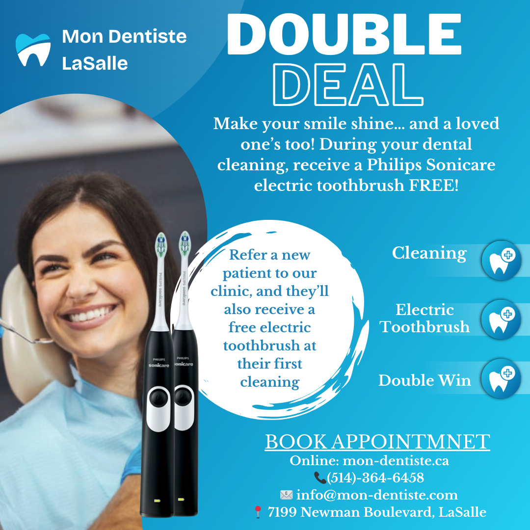 Book your dental cleaning with us and receive a free Philips Sonicare electric toothbrush as our gift to you! To make the deal even sweeter, refer a new patient to our clinic and they'll also get a free electric toothbrush at their first appointment. It’s the perfect opportunity for you and a loved one to achieve a healthier smile together. Contact us today to book your cleaning and claim your free gift!